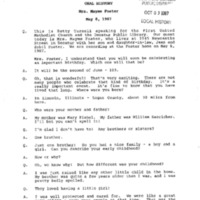 This is the transcription of Mayme Foster's oral history. She was interviewed by Betty Turnell on May 8, 1987. This interview covers her early life, coming to Decatur, working as a seamstress, and her work with the First United Methodist Church in…