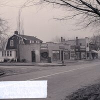 Photograph of businesses located at E. 22nd St. Place and E. Wood St. in 1944. Photograph: "Decatur, city of--Streets --Wood, E. 500 Block at S. Broadway (MLK). Photo taken by George Baker of Decatur in the spring of 1909. St. Mary's hospital is in…