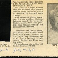 , “League of Women Voters - News Article - President - Carol Campbell - 1981,” Decatur Public Library Local History Photo Collection, accessed October 10, 2025, http://omeka.decaturlibrary.org/items/show/9162.