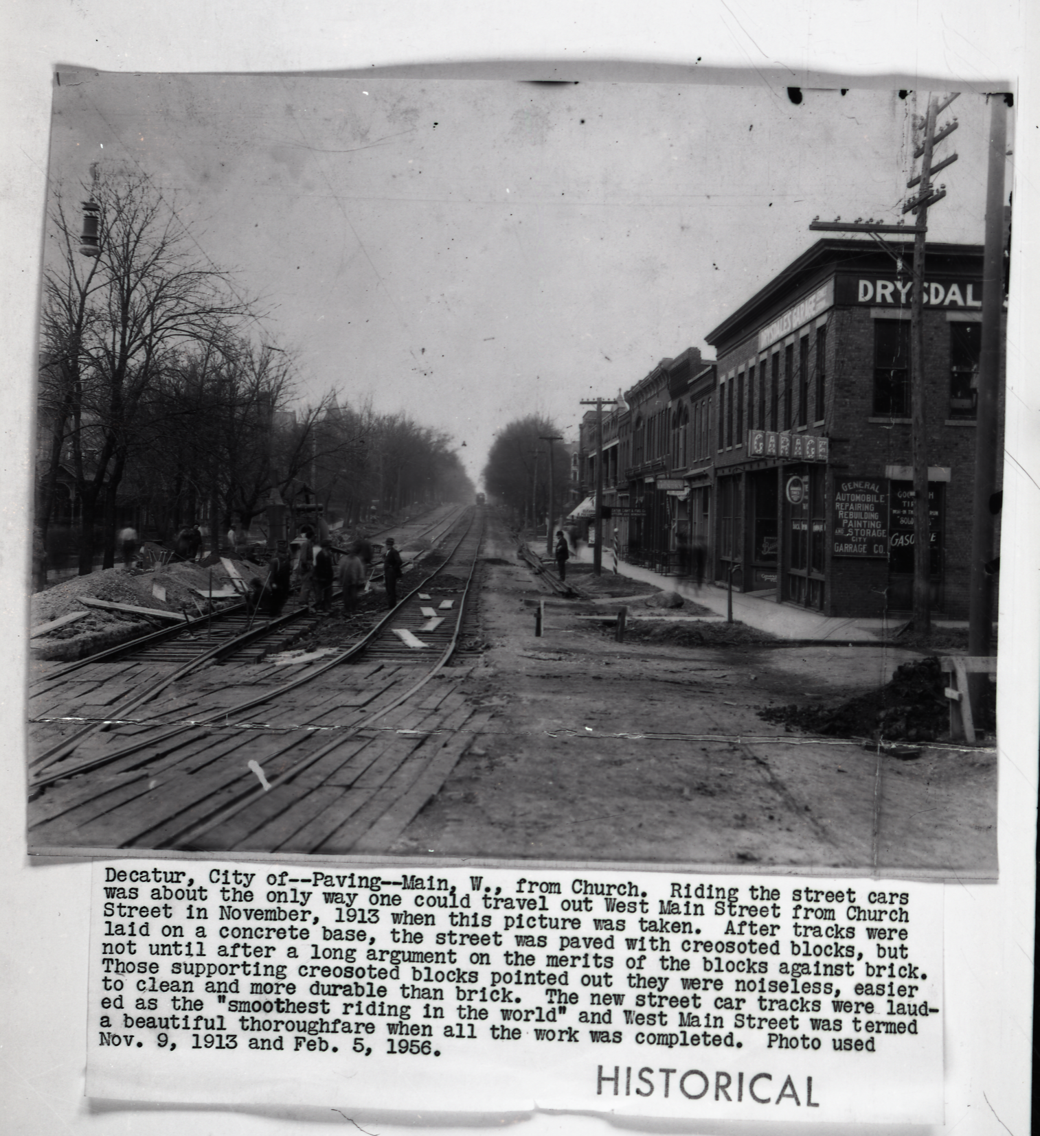 Streets, W. Main St., Businesses, Church St., Paving, Street Car Tracks, Decatur, IL.
