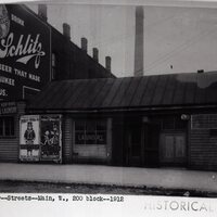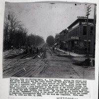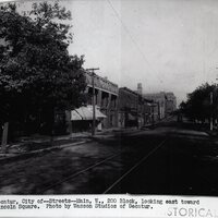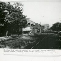 Photographs of the 200 Block of W. Main St, 1912. Photographs of the 200 Block of W. Main looking east toward Lincoln Square, photo by Wasson Studios, c. 1910. Photograph of City paving W. Main from Church. "Riding the street cars was about the only way one could travel out West Main Street from Church Street in November, 1913 when this picture was taken. After tracks were laid on a concrete base, the street was paved with creosoted blocks, but not until after a long argument on the merits of t he blocks against brick. Those supporting creosoted blocks pointed out they were noiseless, easier to clean and more durable than brick. The new street car tracks were lauded as the 'smoothest riding in the world' and West Main Street was termed a beautiful thoroughfare when all the work was completed. Photo used Nov. 9, 1913 and Feb. 5, 1956."