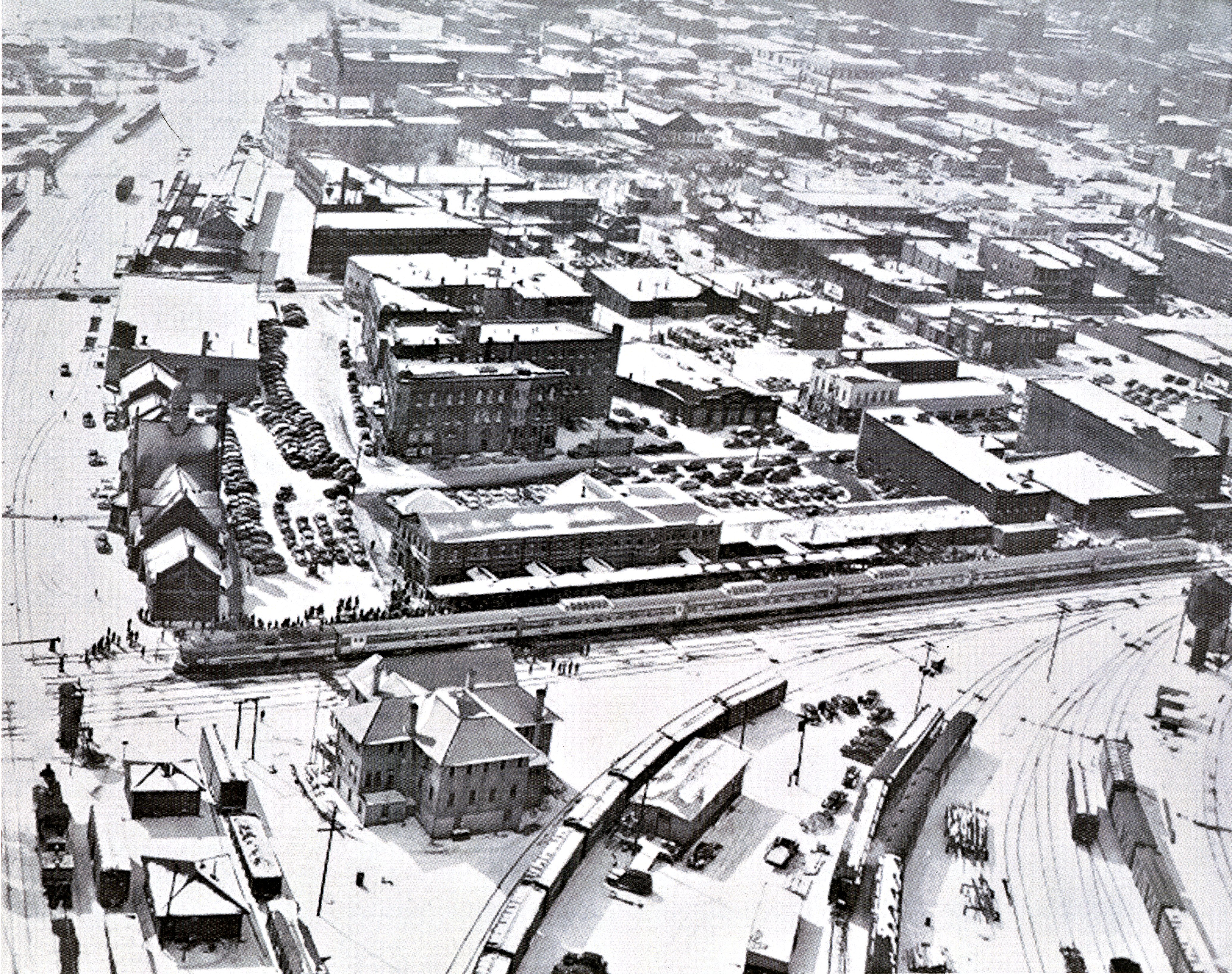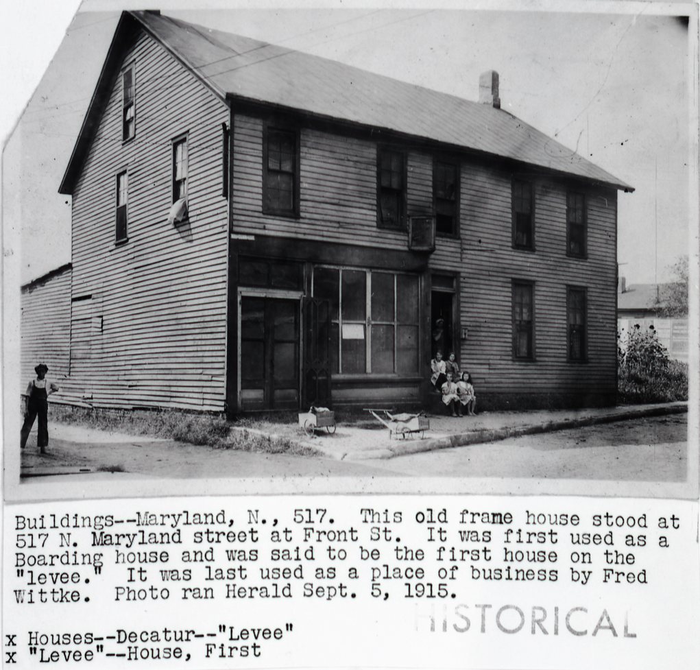 Aerial photograph of the Levee District. Photograph "Building--Maryland, N. 517. This old frame house stood at 517 N. Maryland street at Front St. It was first used as a Boarding house and was said to be the first house on the "levee." It was used as a place of business by Fred Wittke. Photo ran Herald Sept. 5, 1915.