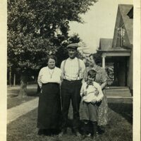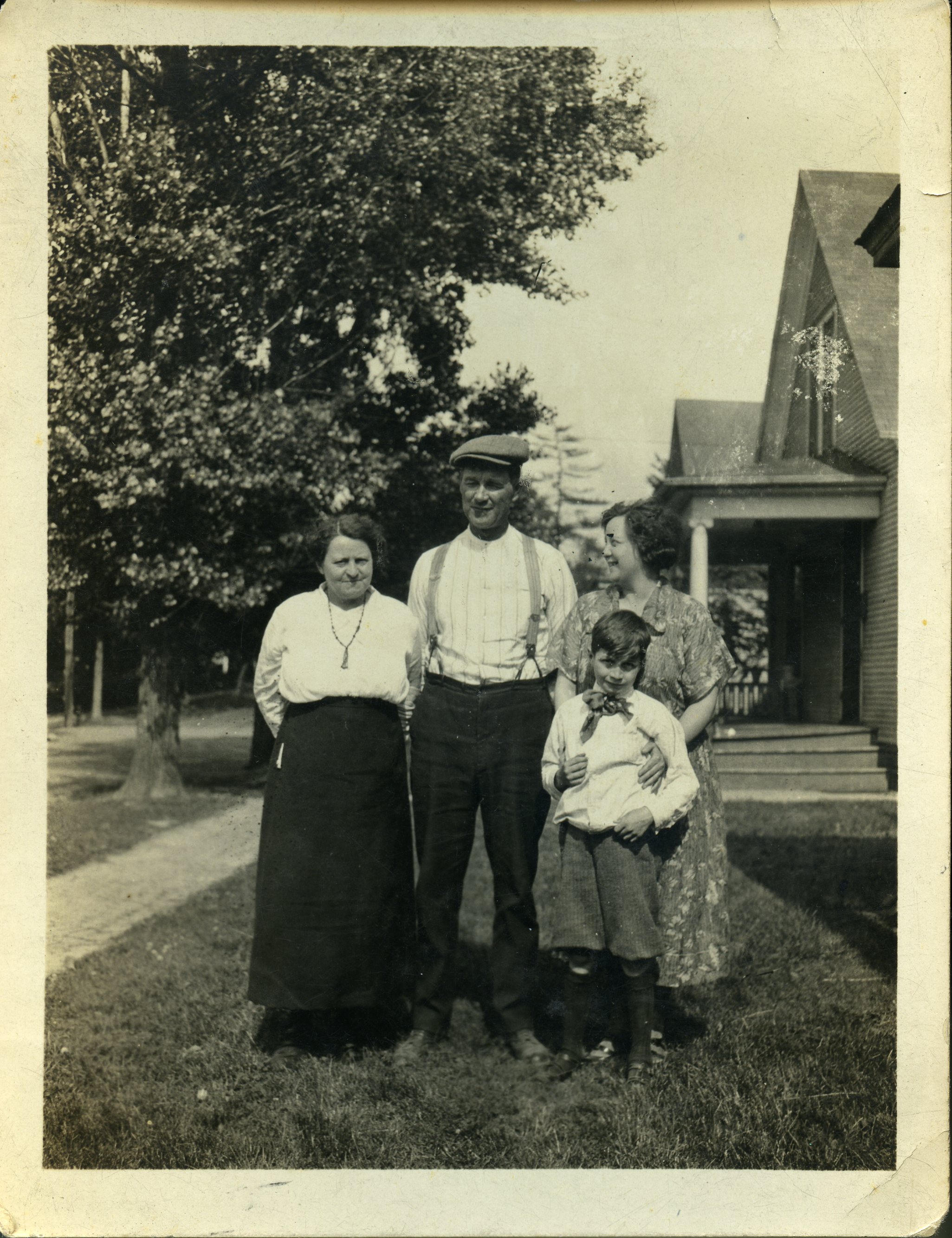 This is a photograph of Aunt Lora with an unknown man, woman, and child