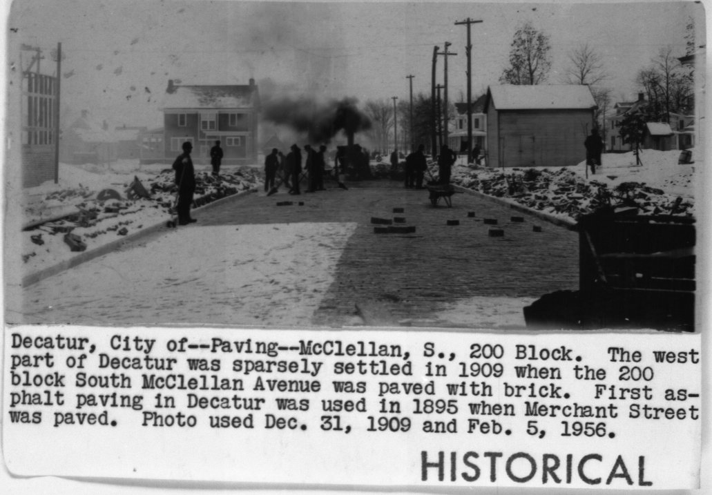 Herald and Review, Decatur, IL., “Photo of 200 Block S. McClellan getting paved,” Decatur Public Library Local History Photo Collection, accessed November 17, 2025, http://omeka.decaturlibrary.org/items/show/9338.