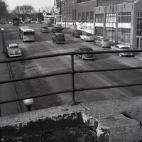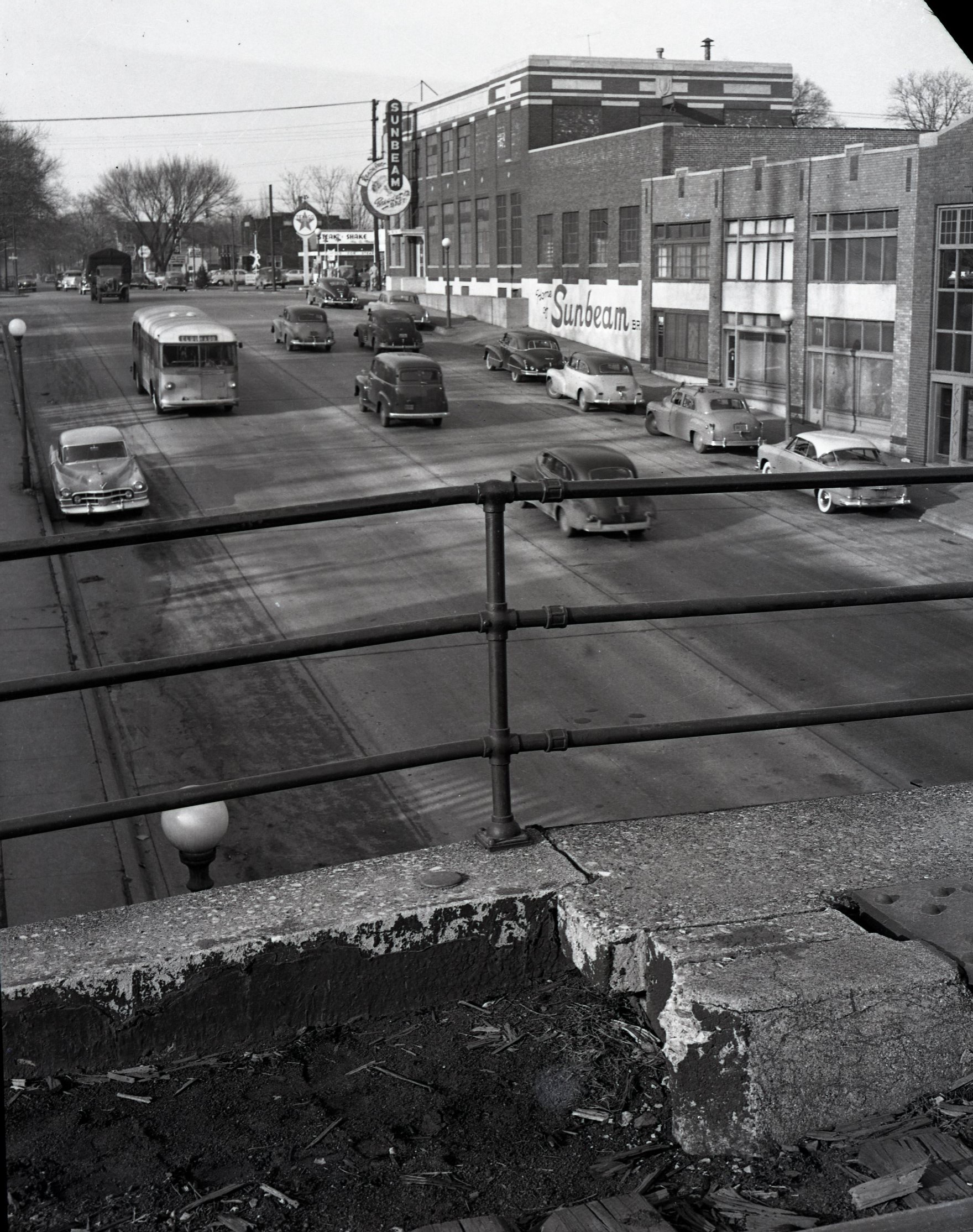 Photographs of North Main Street Subway, automobiles, trucks, train, Sunbeam Bakery, Texaco gas station and homes, Decatur, IL.