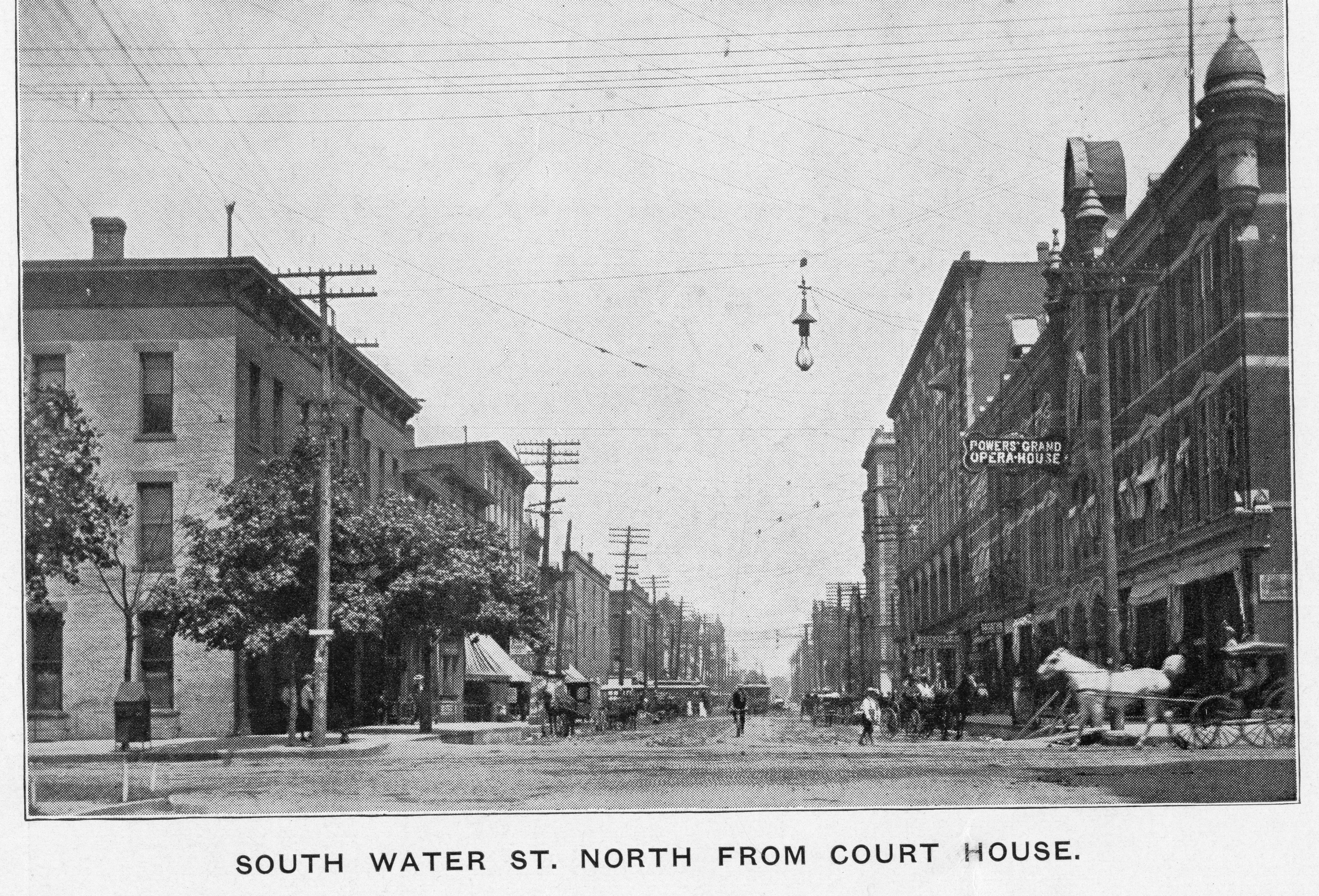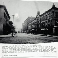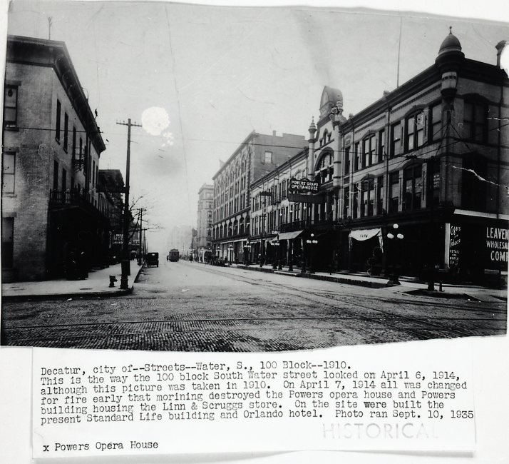 Photograph of S. Water St north from Court House. Photograph of "Decatur, city of--Streets--Water St., S. 100 Block--1910. This is the way the 100 block of South Water street looked on April 6, 1914, although this picture was taken in 1910. On April 7, 1914 all was changed for fire early that morning destroyed the Powers Opera house and Powers building housing the Linn & Scruggs store. On the site were built the present Standard Life building and Orlando Hotel. Photo ran Sept 10, 1935." Photograph Decatur, City of --Streets--Water, S. 100 Block. Looking north from E. Wood St.
