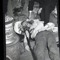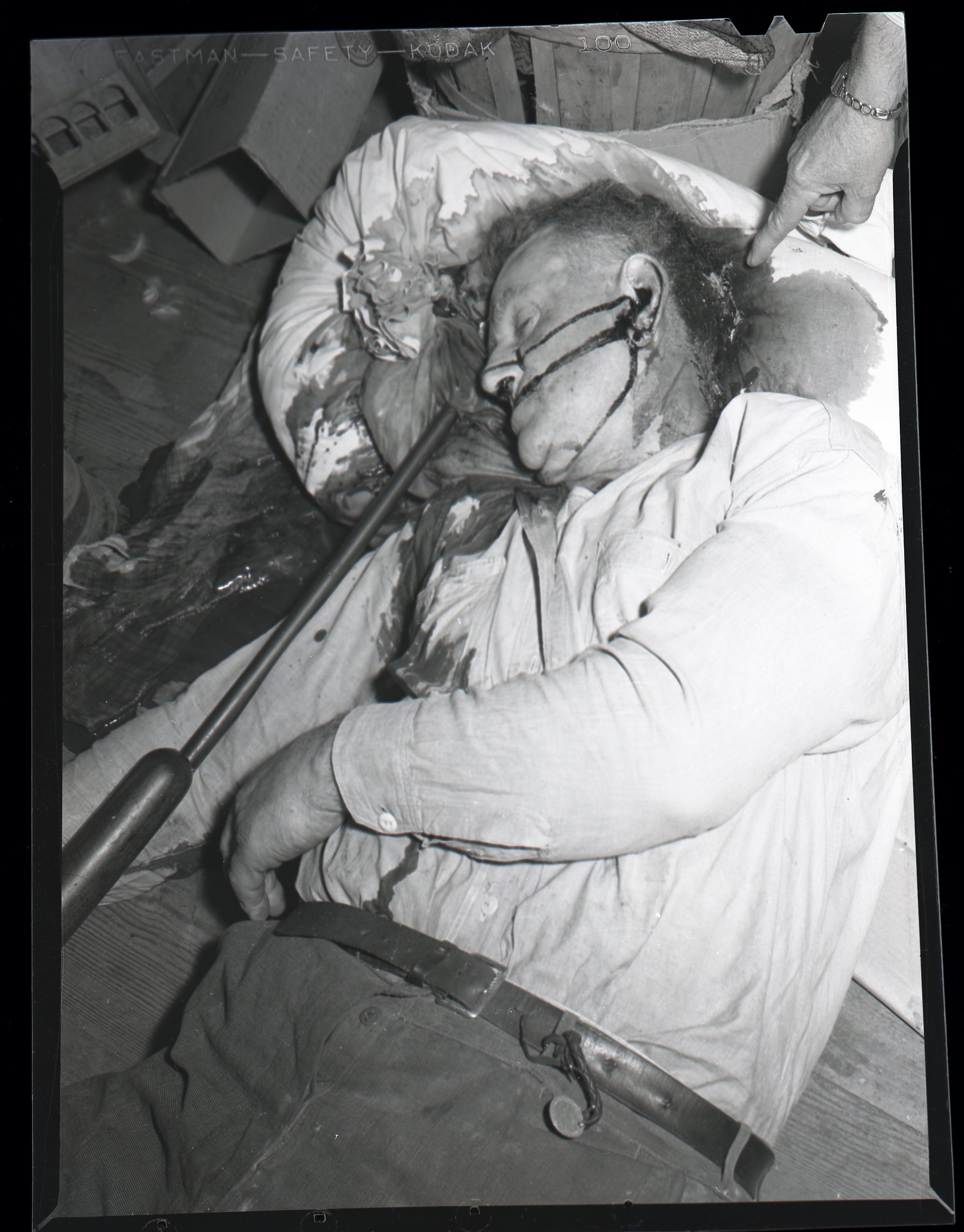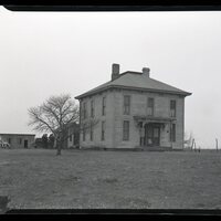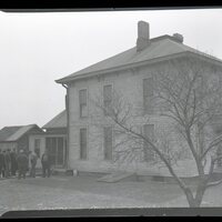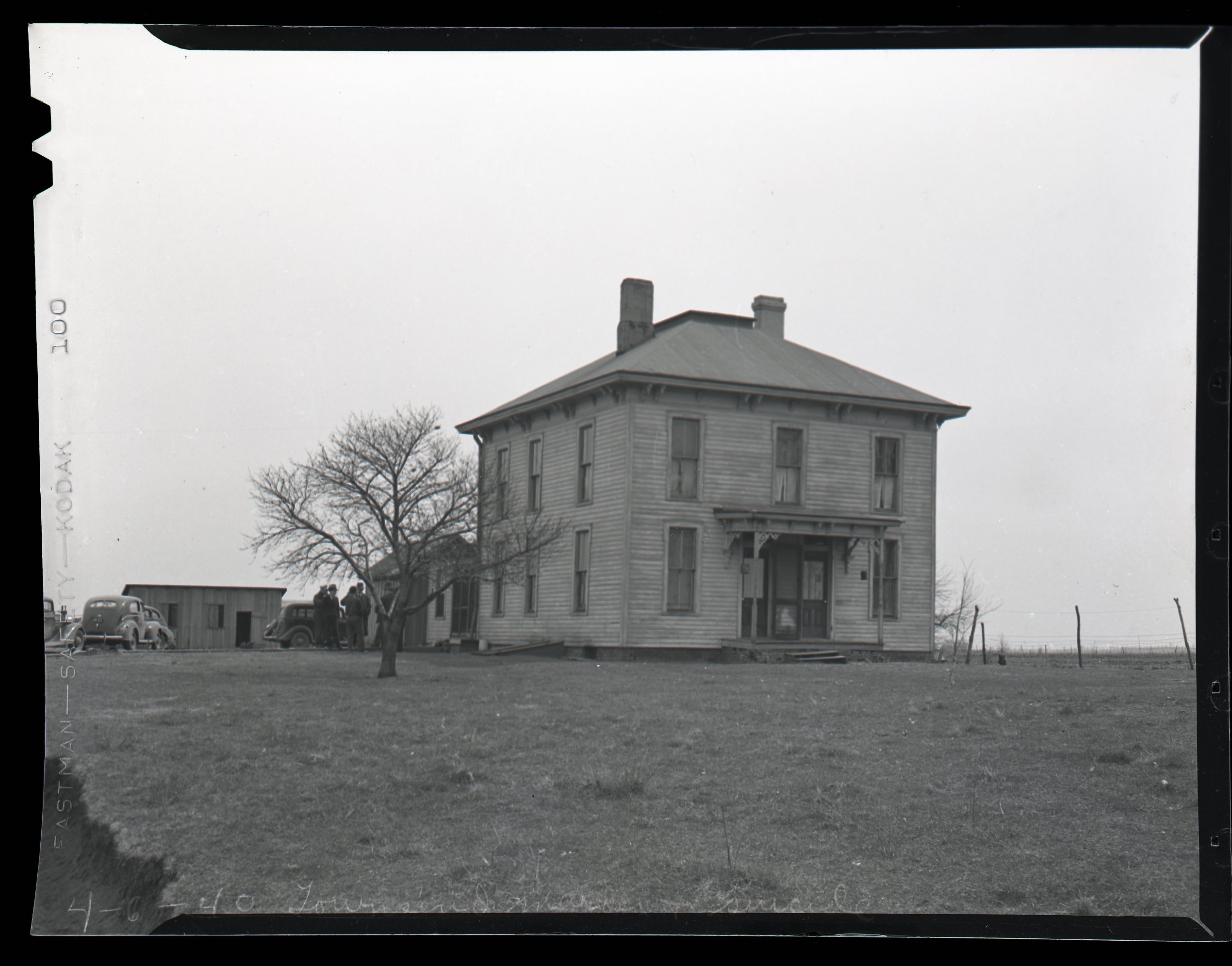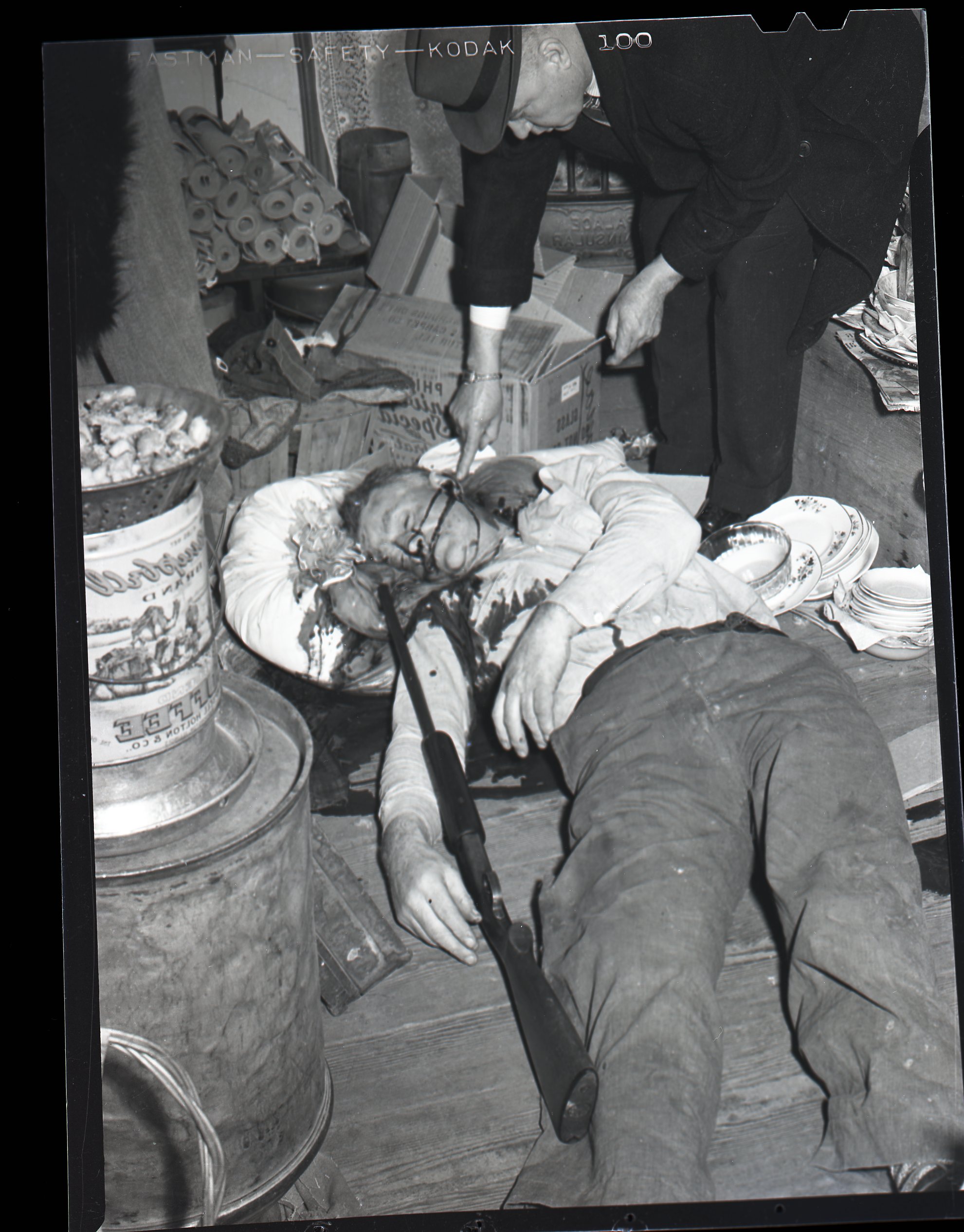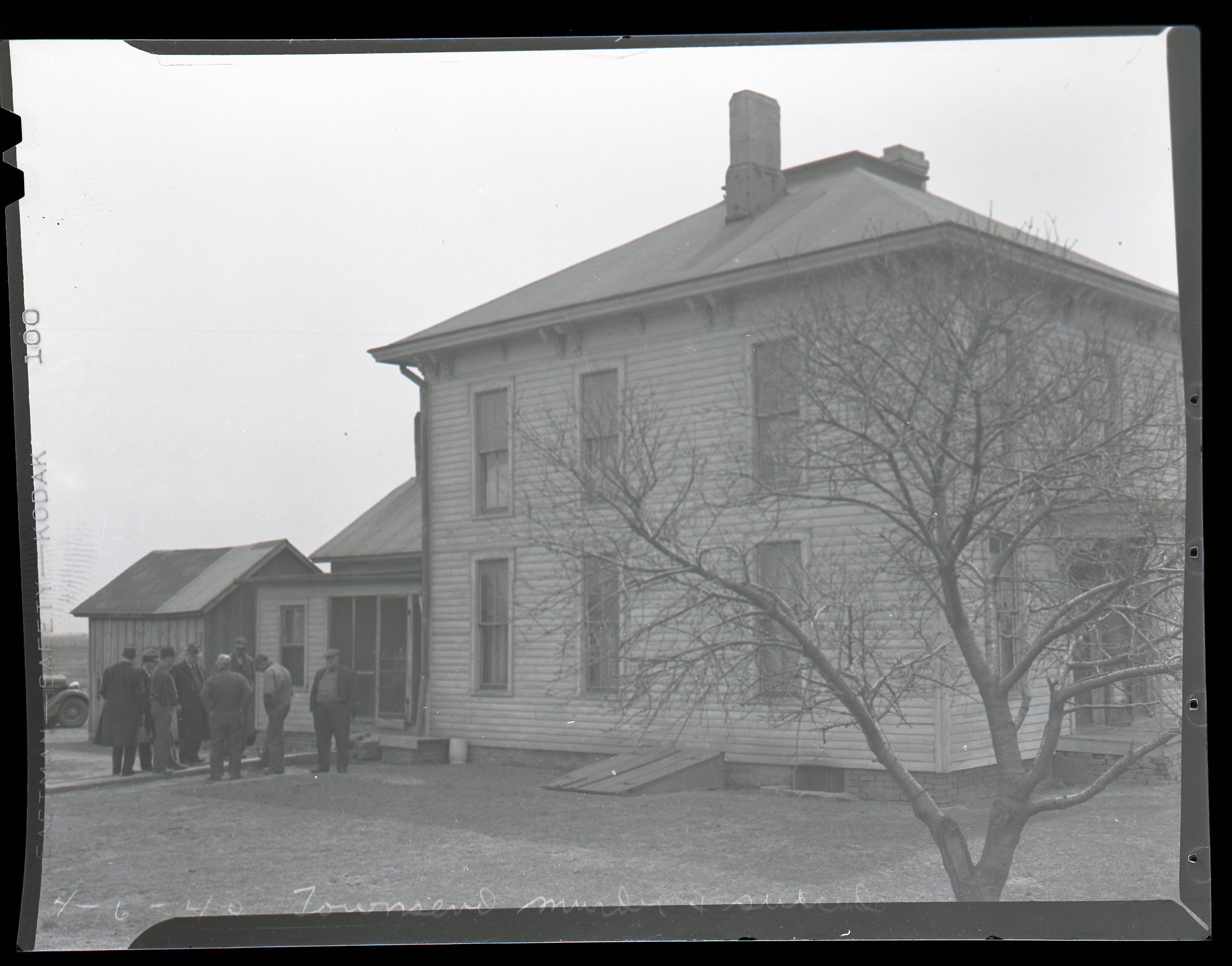 Photograph of Amy Townsend, daughter in law of Ezra Townsend laying dead on the porch. Photographs of Ezra Townsend laying dead on his bedroom floor, possible suicide. Photograph of the farm house near Macon, IL. where the two bodies were found. Photograph of farm house and men investigating the deaths of two people, Ezra Townsend and Amy Townsend.