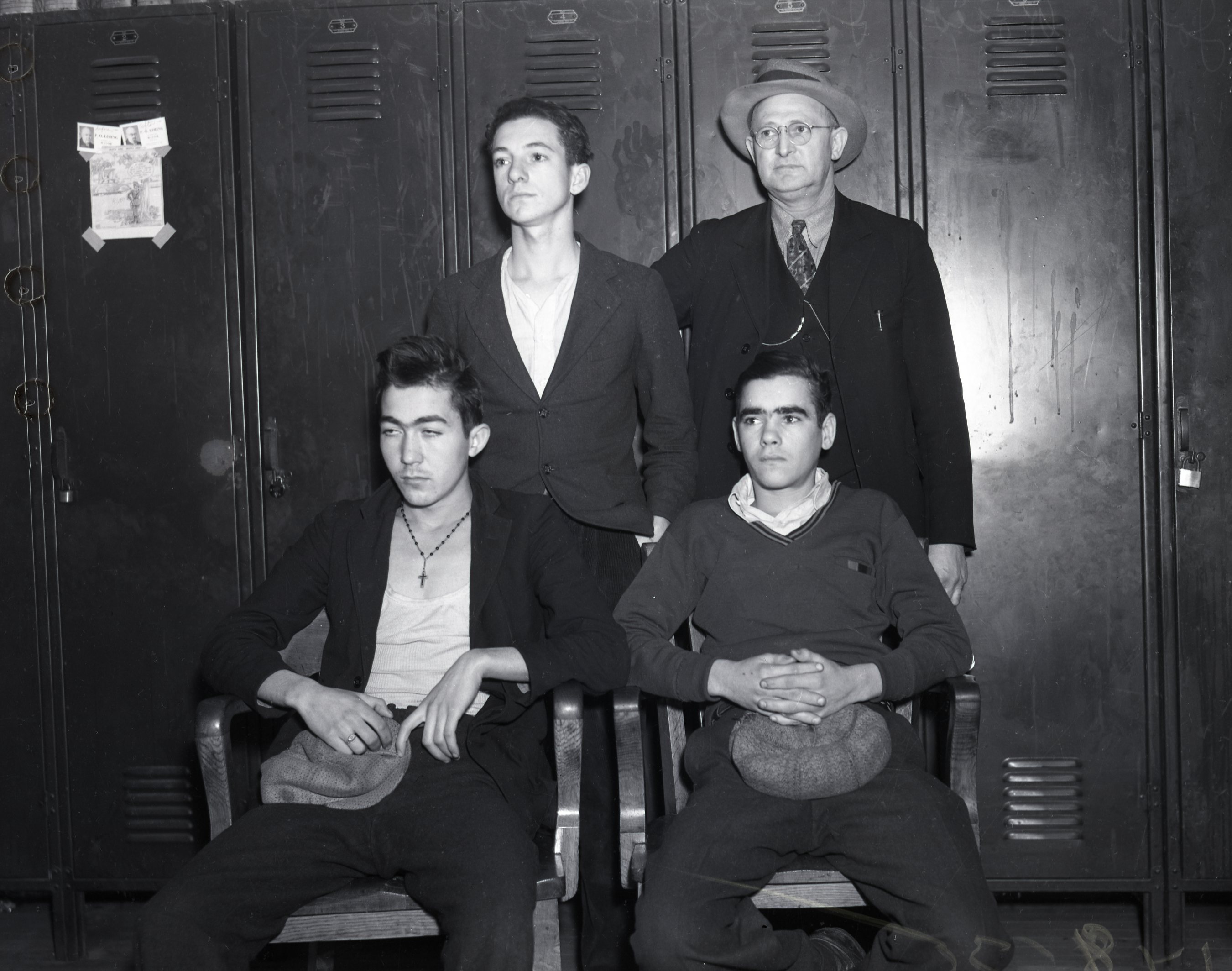 Photograph of John Rosio, leader, Joe Logue, Frank Fry and Officer Al Stander at their arrest in Kansas. They kidnapped Howard Tapscott, taxi driver, his taxi and drove to Kansas where they were arrested.