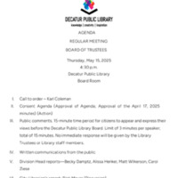 Tags: Agenda, BM3617, Board of Trustees, Budget actuals and projection, capital needs, Check registers and vendor reports, City Librarian Compensation, City librarians evaluation, continuing education and travel policy, Decatur IL, Decatur Public Library, Division Head Reports, finance and properties committee, Friends of the Library, Furniture Project update, Future Agenda Building, Illinois Heartland Library System, Librarians Report, local history collection policy, May 2025, Minutes, monthly meeting, packet, personnel policy and public relations, reports, Rick Meyer, test proctoring policy