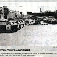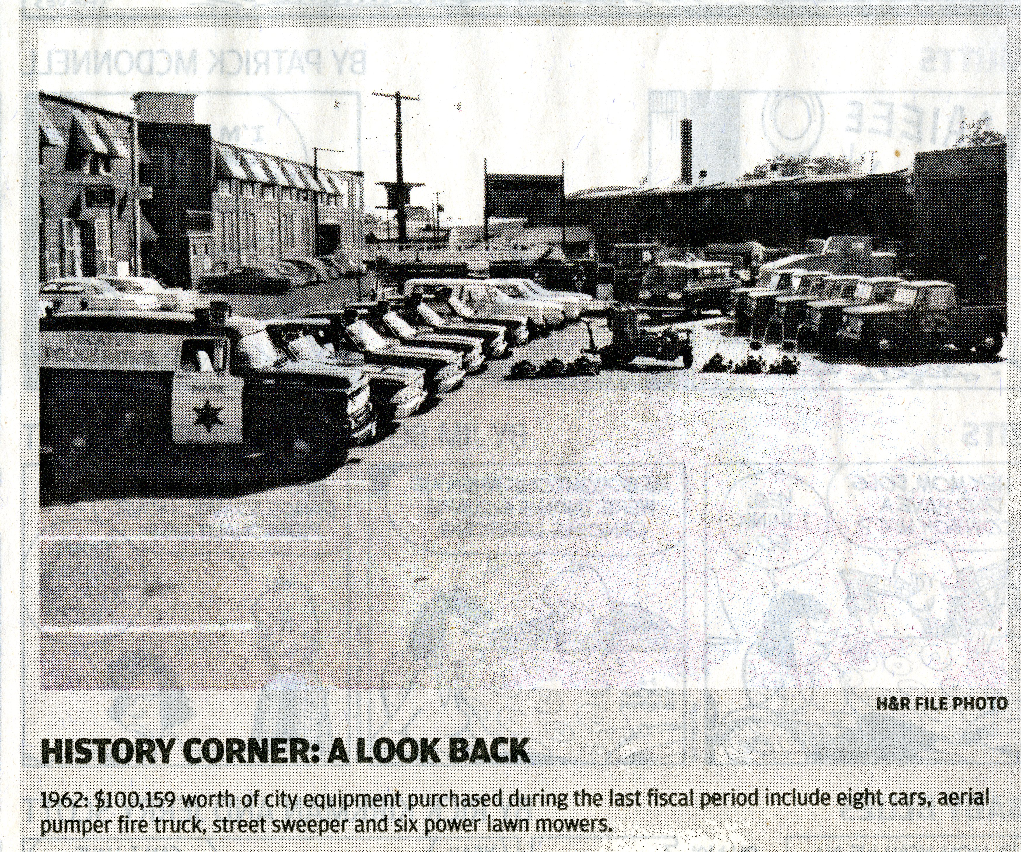 Photograph: History Corner: "1962: $100,159 worth of city equipment purchased during the last fiscal period include eight cars, aerial pumper fire truck, street sweeper and six power lawn mowers."