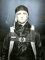 Photo of Raymond A. Tearnan wearing flight jacket, hat and parachute with name