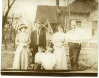 Photograph of Ida, Leonard, and Mabel Grubbs with an unknown man, woman, and boy in front of the Maddox house.