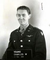 Herald and Review Library: Young, Lt. Charles W.; Article on back of photo; "Lt. Charles Young; Lt. Charles W. Young, whose wife, the former Ruth Gould, lives at 2036 East Prairie avenue, is now stationed at he combat crew training school at Sioux City, Iowa, according to word from his base. Lieutenant young, a pilot of a heavy bomber, former manager of Young's Market, entered service Sept. 15, 1942, and after taking operational training with his crew will be assigned to duty overseas."