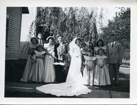 Photograph of Vadah Curfman, Larry Ross, and their wedding party in front of the Curfman house on their wedding day (10/1/1948).