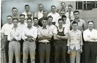 Herald and Review Library: Photo of Macon County Draftees; Article on back of photo: "Macon County rural draft board sent 23 1-A men to Peoria today for induction into the army. The group constitutes the board's quota for the early August call. Nine other rural selectees went in the 1-B group. The rural board 1-A men are shown above as they appeared yesterday when they received final instruction from the board at the County building. Virgil Walker, 443 North Morgan street, was named as leader for the rural group on the trip to Peoria today."