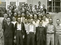 Herald and Review Library: Photo of men standing in front of the courthouse; Article on back of photo; "Forty men from the rural areas of Macon county who were scheduled to leave this morning for physical examination at Peoria are shown here. They all received their orders from the Macon County rural board. The selectees, left to right are: First row: Kenneth R. McCoy, Burton F. Willis, Donald Wilson, Glen K. Coffman, E. Everett Terry, Paul A. Wright. Second Row: Carl W. Randall, Marion M. Harrison, Byron D. Easterling, Richard R. Adams. Third Row: Walter G. Cropper, Ralph R. Thompson, Frank K. Huffman, William G. Clark, John Hubert Trusner, William N. Riley. Fourth Row: Dale W. Robertson, Charles F. Jones, Russell J. Wendling, Thomas P. McGee, Dale A. Damery. Fifth Row: William M. Smith, Raymond H. Mitchell, Freeman C. Riley, Perry F. Elliot, Reece H. Upchurch. Six Row: J. James Snyder, Richard A. Leach, John D. Long, William E. Braden, Marvin B. Harris. Seventh Row: Donald K. Wantling, Edward C. Koshinski, Contingent Leader Gene Creekmur, Assistant Leader O. Frank Burns. Eighth Row: Howard M. Foster, Harless A. McKinley, Harry D. Winholtz, Harley Maddox, William J. Danner."