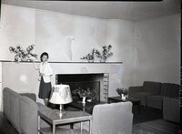 Negative of an unknown woman standing by a fireplace inside the clubhouse of the South Side Country Club on June 4, 1941.