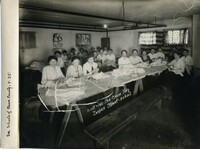 Ladies Sitting Around Picnic Tables Making Bandages, Written on photograph "Eastside Red Cross Hdq. Jasper Street School."