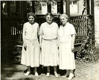 Photograph of Maria Buckingham, Mrs. Lynn Barnes, and Mrs. John Cantrall standing in front of a house. Maria Buckingham (d. 7/30/1937) was a native of Decatur and a prominent member of several civic organizations. She was the secretary of the Decatur Arts Institute until 1937, treasurer of the Anna B. Millikin Home for 41 years, a charter member of the Decatur Women's Club, and an active member of the DAR. She was also interested in politics and was a district chairman of the Women's Democratic organization in 1927. She was also a member of the Robinson Genealogical Society, Inc. Buckingham rode the first Illinois and Indiana Central R.R. train (B&O) that came to Decatur in 1874. The photo was used in the Decatur Daily Review on September 3, 1933.