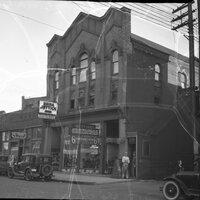 Photograph of buildings E. Prairie, 100 Block at Merchant St. The brick building between Merchant St. and the alley next to the church was built in 1888 and occupied by the Citizens National Bank until 1910 when their new building on N. Water was built. Post & Sons, shown at right at the rear of the bank building, then moved into the bank building and in 1955 still occupied that site. At left, in the background, is the Universalist church which is the 1956 site of Williams.