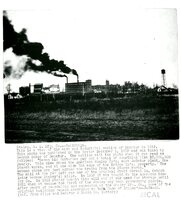 Photograph of A. E. Staley, Mfg. Co. This is a view of the east and industrial section of Decatur in 1912. This photo was published in the Review December 1, 1912 and was taken by George Baker of Decatur. The cutline with the photo when it ran read as follows: "Seven big factories pay out a total of somethings like $3,000,000 yearly. This view shows the American Hominy Co.'s east Decatur plant, the Starch works, and at one side the edge of the Bridge Co's property. 'The Wabash shops are just across the tracks from the Starch Works." The mill at the far left was one of the original Pratt Cereal Co. (which later became Staley's) mills. In 1902 it was bought by American Hominy co. In 1919 Staley bought this mill and it was used for storage until 1921 when it became the first of the Staley soy bean processing plants. After years of remodeling and expansion at the Staley Mfg. Co., none of the original buildings remain according to Ruth Cade of Staley's 2/24/1955. (Information from clips and Decatur and Macon Co. History.)