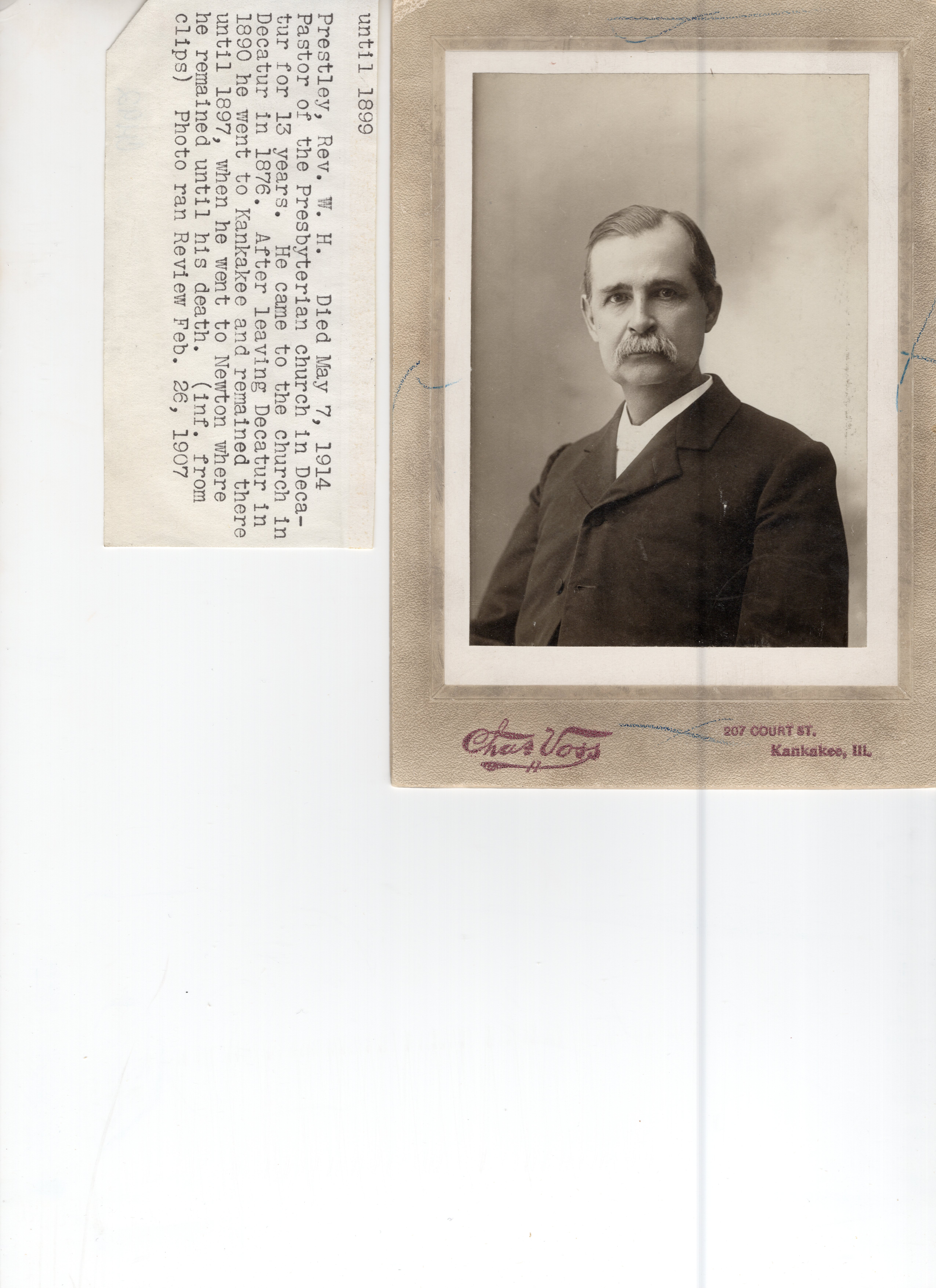 Photograph of Rev. W. H. Prestley; (died 5/7/1914). Pastor of the Presbyterian church in Decatur for 13 years. He came to the church in Decatur in 1876. After leaving Decatur in 1890 he went to Kankakee and remained there until 1897, when he went to Newton where he remained until his death. (Information from clips). Photo ran Review 2/26/1907.