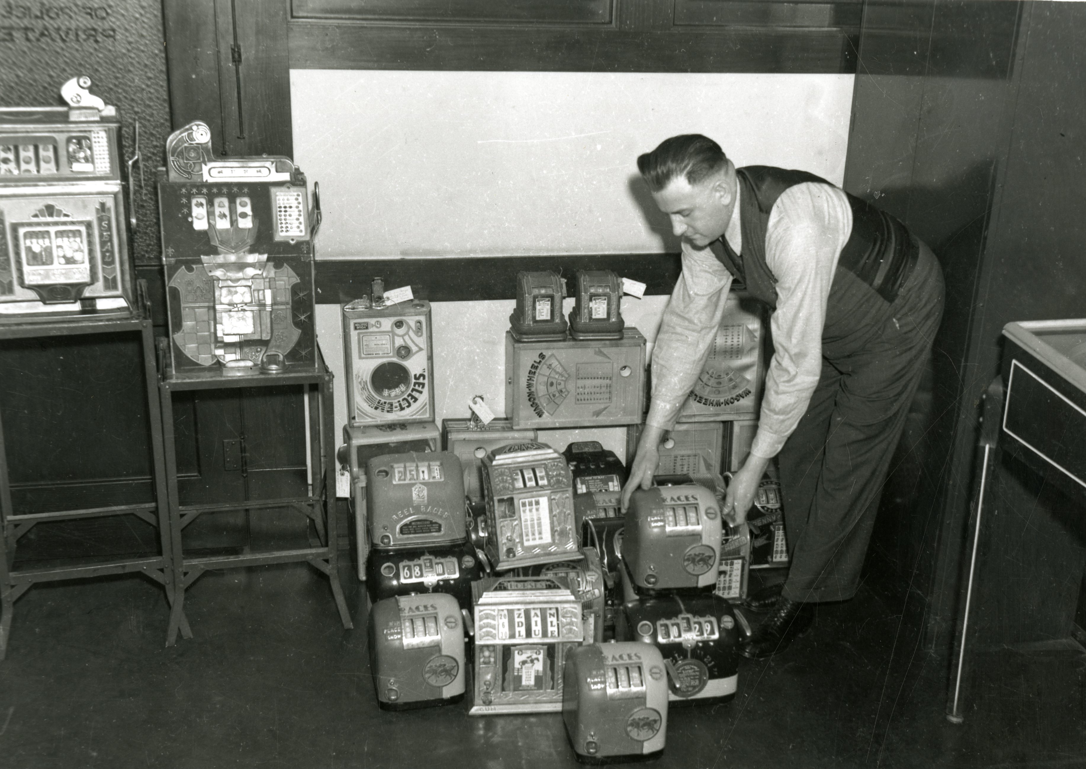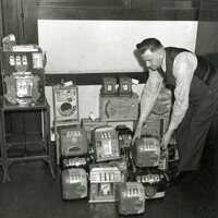 Photograph of slot machines raided by police in the 1940's.