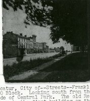 Photograph of the 100 Block N. Franklin, looking south from the east side of Central Park. The old Revere House is the first building on the left. Photograph of Public Market East Side of Central Park on N. Franklin, 1911-1913. Photograph of 100 Block N. Franklin, buildings pictured were torn down in Jan 1923. Photograph of 100 Block N. Franklin between E. Prairie and S. Park Street. Photograph ST725: "United States Gov't: Post Office Decatur Site. This photo taken from the southeast corner of Central Park, is the 200 Block N. Franklin, the site of the Post Office in Decatur. Photo by 'Hod' Lewis of Decatur, 1/11/1933. Photograph of the aerial view of N. Franklin Street, dated 6/15/1965. Photograph of N. Franklin Street, dated 12/27/1962. Photograph of N. Franklin Street, dated c. 1940.