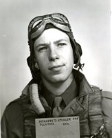 Photo of Kenneth D. Heckler in flight uniform holding sign with name and serial number