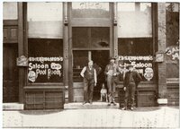 Photograph of Ed Frahlman's Saloon and Pool Room with three men and a dog in front of the building.