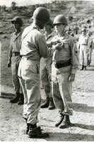 Herald and Review Library: Mitchell, Sgt. James E., Article on back of photo; "Master Sgt. James E. Mitchell, husband of Mrs. Mary Reed Mitchell, 1013 East Eldorado street, receives the Bronze star medal from Maj. Gen. P. W. Clarkson, commanding general of the 33rd infantry division on Luzon. Sergeant Mitchell is supply sergeant for the 130th Infantry, senior regiment of the former Illinois National Guard unit. The medal was presented for meritorious service in support of military operations against the Japanese on northern Luzon."