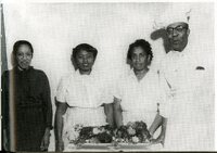 Photograph of the Hickory Pit Restaurant owners Eddie and Grace Copeland and two other women. The restaurant was located at Cleveland and Franklin streets.