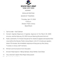 Board of Trustees, “Board of Trustees - April 2025 - monthly meeting - agenda - packet - minutes - reports,” Decatur Public Library Local History Photo Collection, accessed March 14, 2026, https://omeka.decaturlibrary.org/items/show/9823.